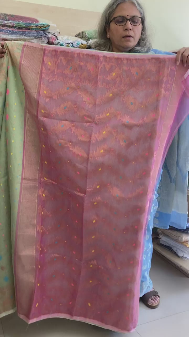 🎨 Color: Elegant soft pink base with intricate resham Jamdani motifs