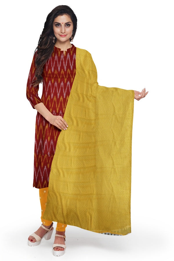 Red And Yellow Cotton Printed Salwar Suit Fabric with Chiffon Dupatta